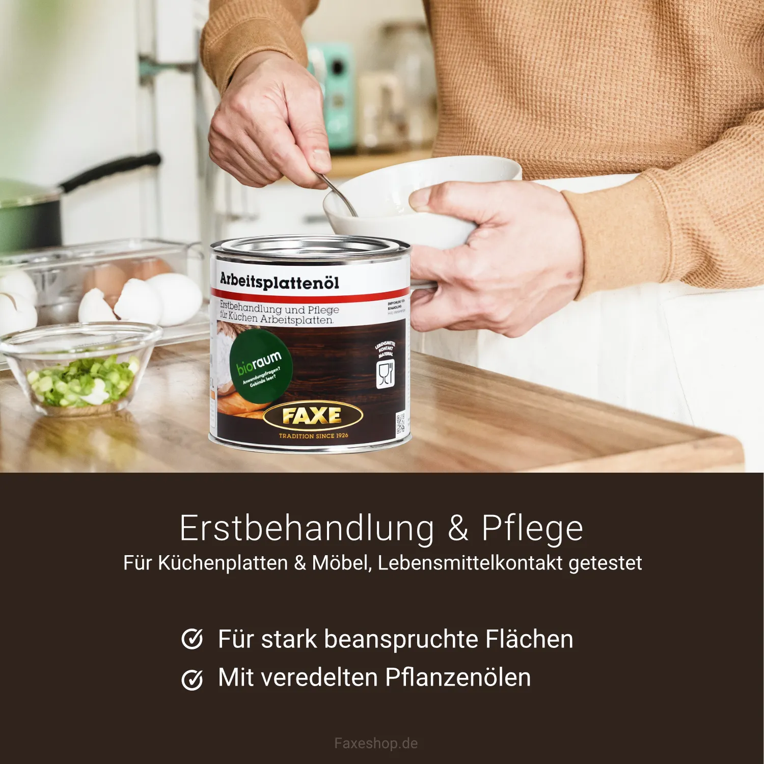 Ölbehandelte Arbeitsplatten können mit einem weichen, feuchten Tuch abgewischt werden. Sollten sich Anzeichen von Verschleiß oder Wasseraufnahme zeigen, wird die Oberfläche mit dem FAXE Intensivreiniger gereinigt und mit dem FAXE Arbeitsplattenöl nachpoliert.
