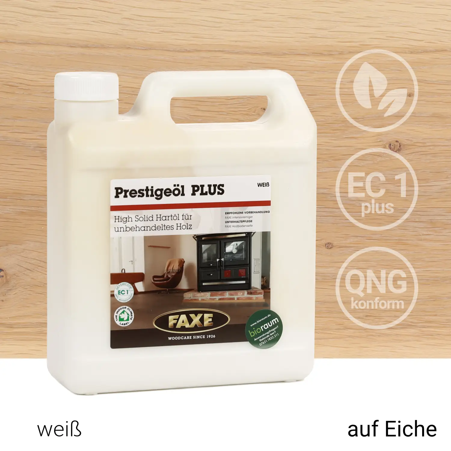 FAXE Prestige Öl wird für unbehandeltes oder gelaugtes Massivholz und Parlkett im Innenbereich verwendet. Das Prestigeöl Plus erfüllt die Anforderungen für EC1 Plus Klassifizierung, eine Premiumklasse für besonders emissionsarme Bauprodukte, die die höchten Umwelt- und Gesundheitsansprüche erfüllen. Es macht das Holz schmutzabweisend und strapazierfähig. Das Prestigeöl besitzt einen sehr hohen Gehalt an veredelten Pflanzenölen (99%) und kann maschinell, sowie auf kleinen Flächen mauell verarbeitet werden.