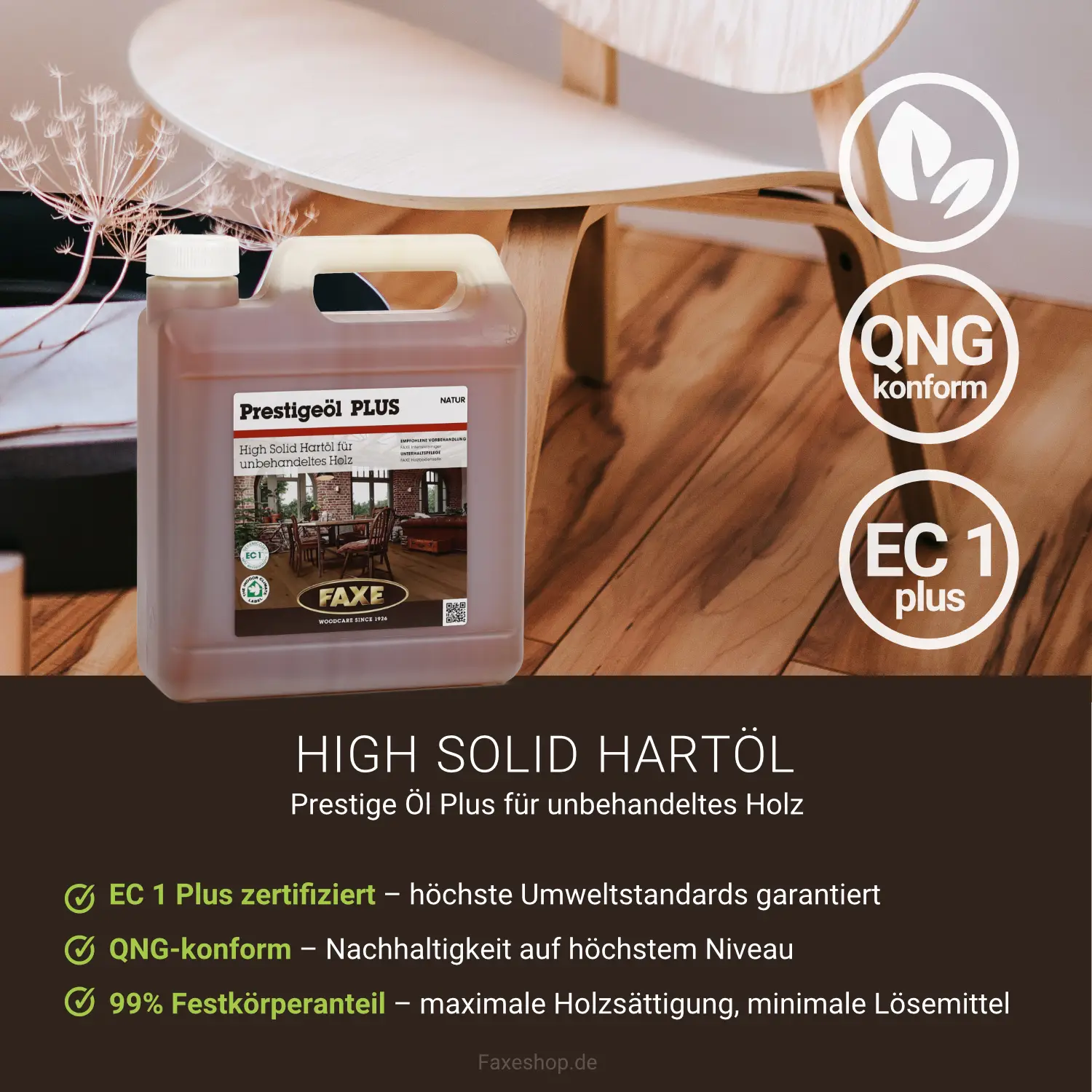 FAXE Prestigeöl PLUS wird für unbehandeltes oder gelaugtes Massivholz und Parlkett im Innenbereich verwendet. Das Prestigeöl Plus erfüllt die Anforderungen für EC1 Plus Klassifizierung, eine Premiumklasse für besonders emissionsarme Bauprodukte, die die höchten Umwelt- und Gesundheitsansprüche erfüllen. Es hat einen sehr hohen Gehalt an veredelten Pflanzenölen (99%). Das Holz wird schmutzabweisend und strapazierfähig. Das Prestigeöl PLUS kann auf kleinen Flächen mauell oder bei großen Flächen maschinell verarbeitet werden.