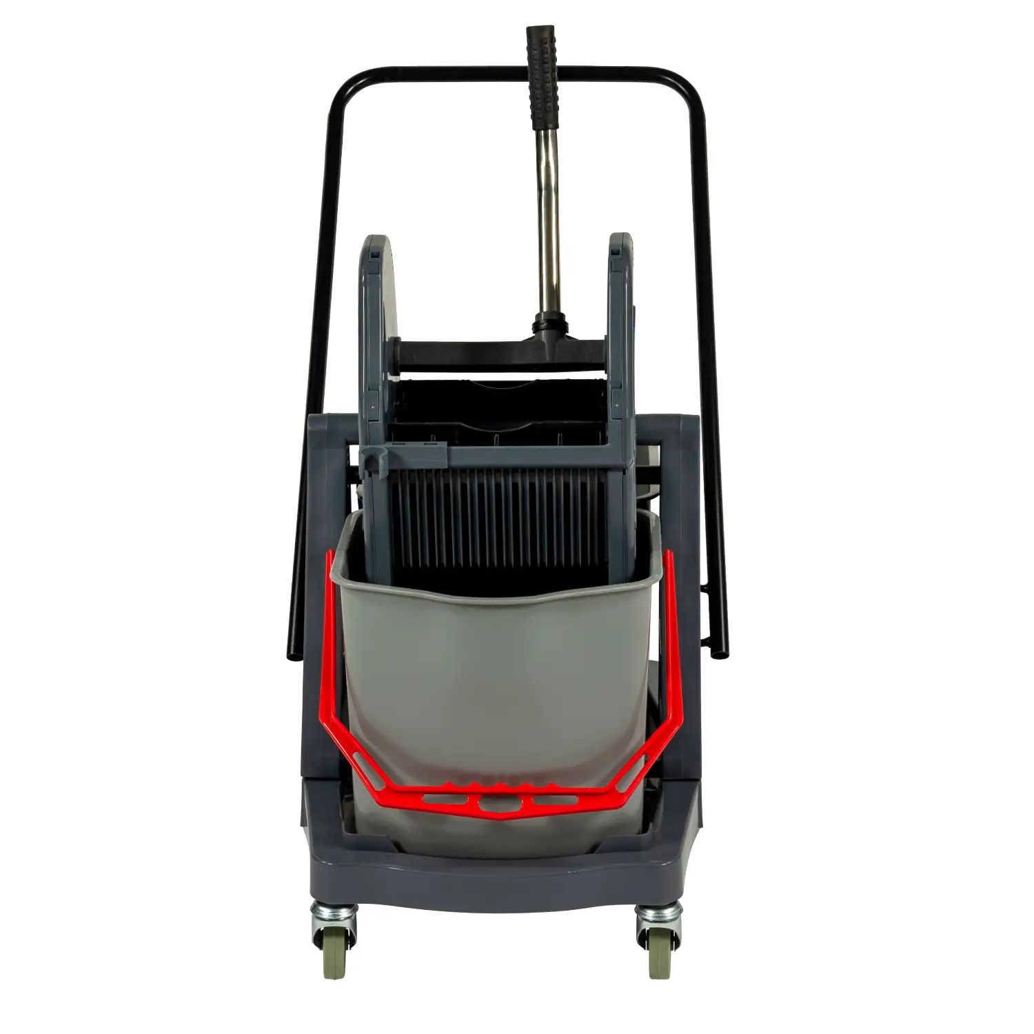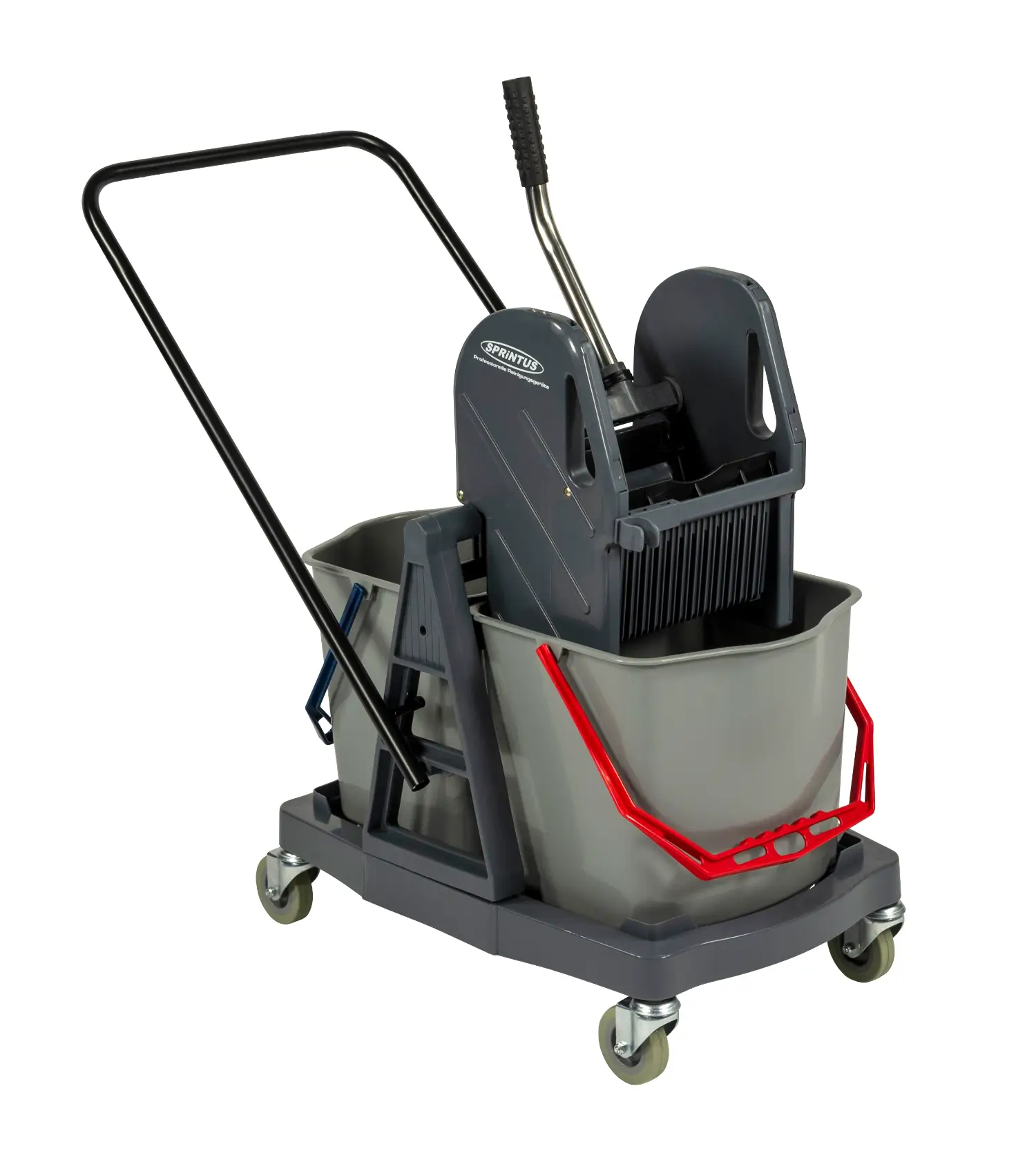 Der Doppelfahreimer aus robustem Kunststoff mit Metalldeichsel verfügt über zwei farblich getrennte Eimer mit jeweils 17 Litern Inhalt. Zusätzlich ist der Doppelfahreimer mit einer kraftvollen Doppelbacken-Mopp-Presse ausgestattet die zudem eine robuste Mechanik hat. Die Lenkrollen mit Gummirädern sorgen dafür, dass das Bedienen des Doppelfahreimers klapperfrei ist und ein einwandfreies Arbeiten ermöglicht. Der Ablagekorb ist nicht im Lieferumfang enthalten!